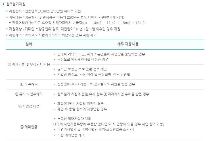 소상공인 폐업지원금 중 점포철지지원의 내용은 아래와 같습니다.