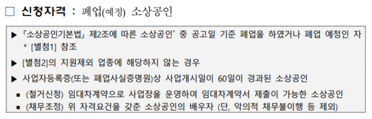 대상자는 경영위기 소상공인 또는 폐업 또는 예정 소상공인이며