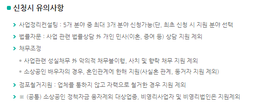 - 신청 : 4개 분야(사업정리컨설팅, 점포철거지원, 법률자문, 채무조정) 중 희망하는분야를 선택